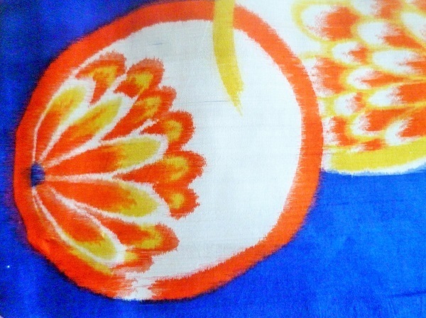 【色柄】 青地に朱、黄、白の3色を使って、大きな歪んだ楕円形の意匠を織り出す。